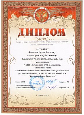 Воспитатели МБДОУ "Детский сад № 31" Буланова Ирина Павловна, Чилегина Галина Васильевна, Шитикова Анастасия Александровна заняли 3 место в региональном конкурсе методических разработок "Волшебный мир финансов" в номинации "Авторские дидактические игры и пособия".